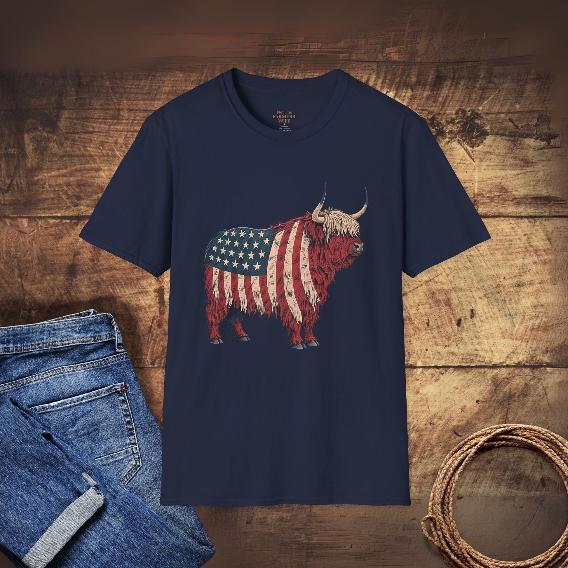 A little bit country, a whole lot proud. This tee features a majestic highland cow decked out in red, white, and blue — perfect for farm-loving Americans who like their fashion with horns and heart. Soft, striking, and made to turn heads from the barn to the BBQ.