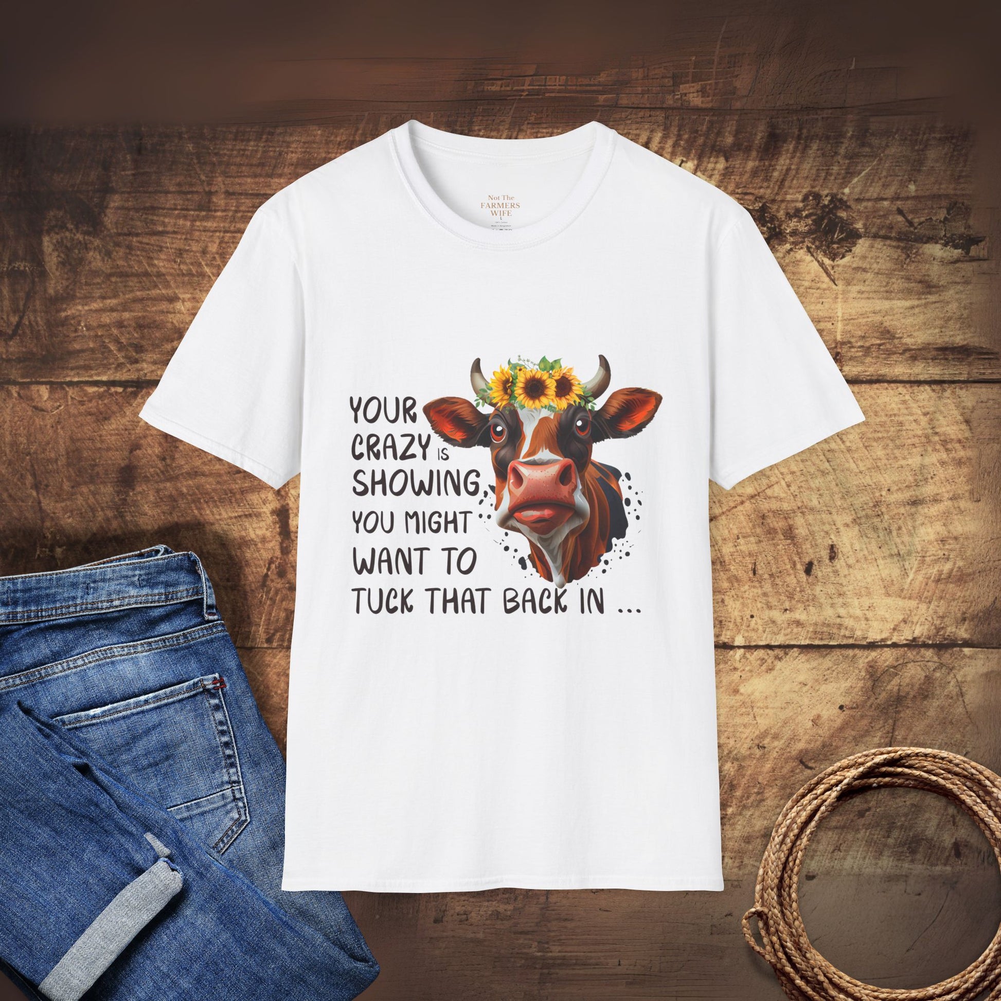 Whether you're out and about, lounging at home, or attending a BBQ, this shirt is sure to bring a smile to everyone's face. So why wait? Order your "Your Crazy is Showing" tee today and show off your love of cows and sense of humour in style!